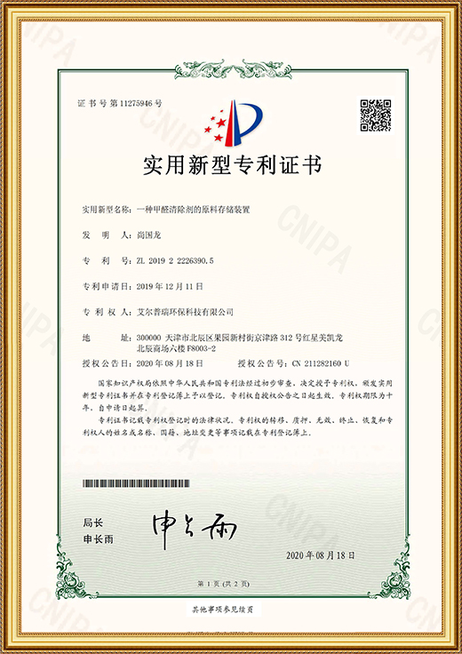 • 實用新型專利證書(一種甲醛清除劑的原料存儲